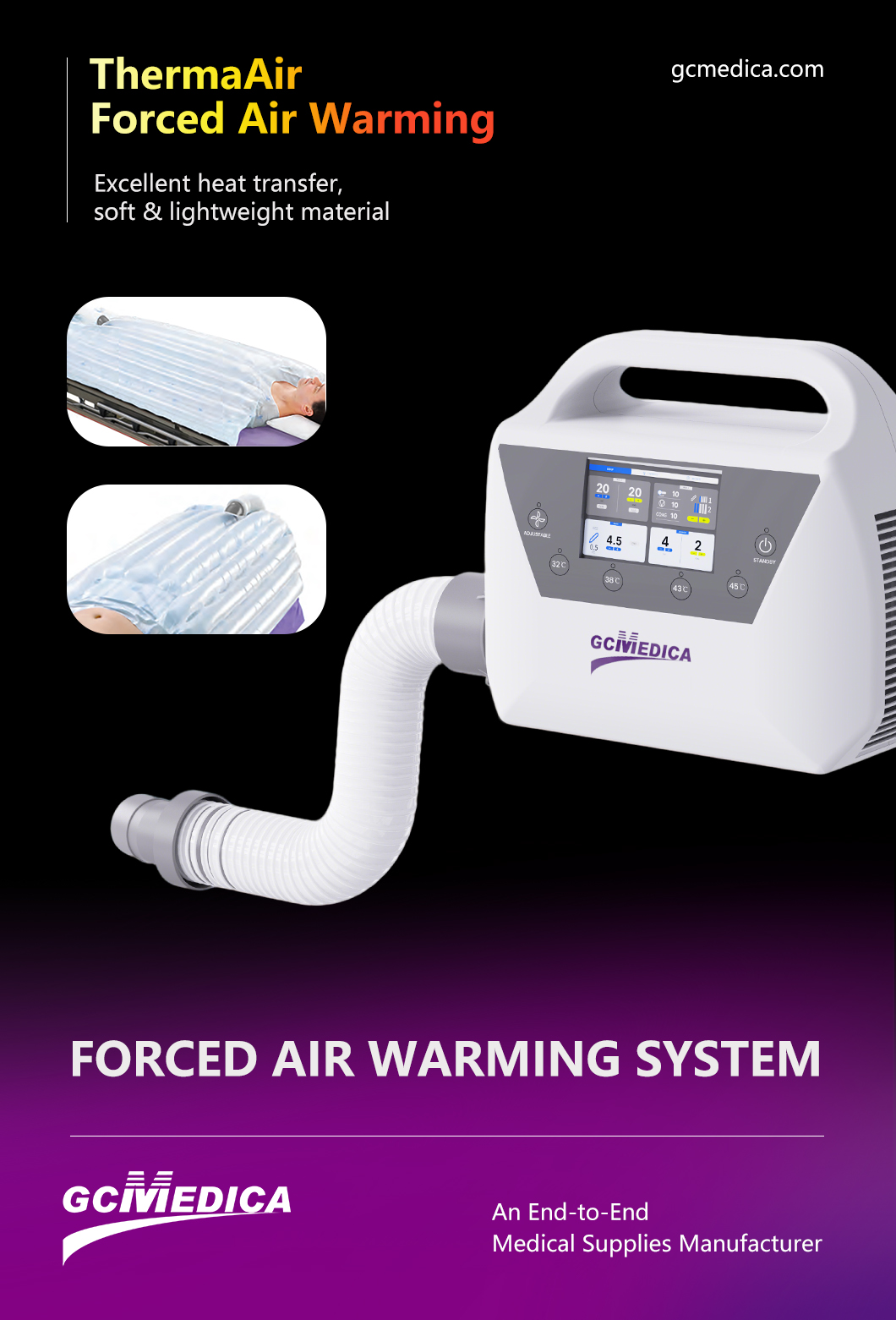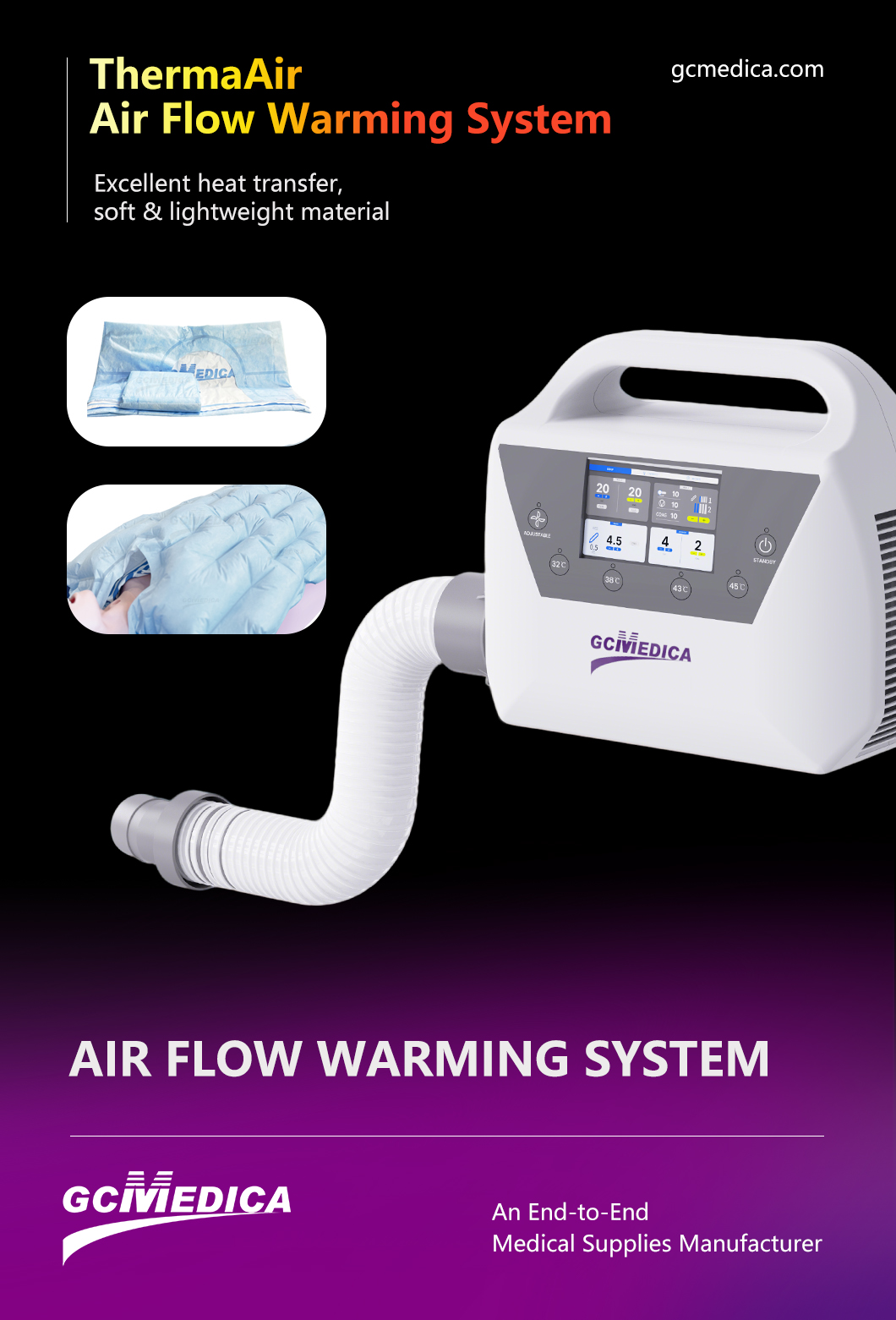 Used in conjunction with Air Warming Device, by controlling the temperature of the blanket, the human body in vitro physical warming to achieve the purpose of assisting in regulating the body temperature.